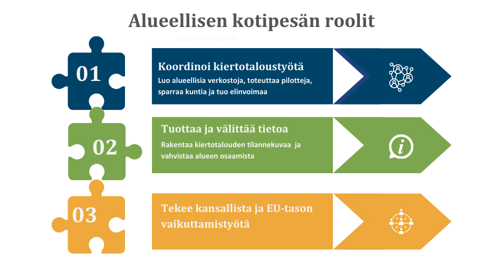 Alueellinen kotipesä voi toimia kiertotalouden koordinaattorina, tiedonvälittäjänä ja alueensa vaikuttajana kansallisesti ja kansainvälisesti. Se luo verkostoja, toteuttaa käytännön pilotteja, sparraa kuntia strategiatasolla ja kiihdyttää alueen elinvoimakehitystä. Se on rakenne, joka voi sulautua jo olemassa olevaan organisaatioon, kuten maakunnan liittoon, elinvoimakeskukseen tai kehittämisyhtiöön.