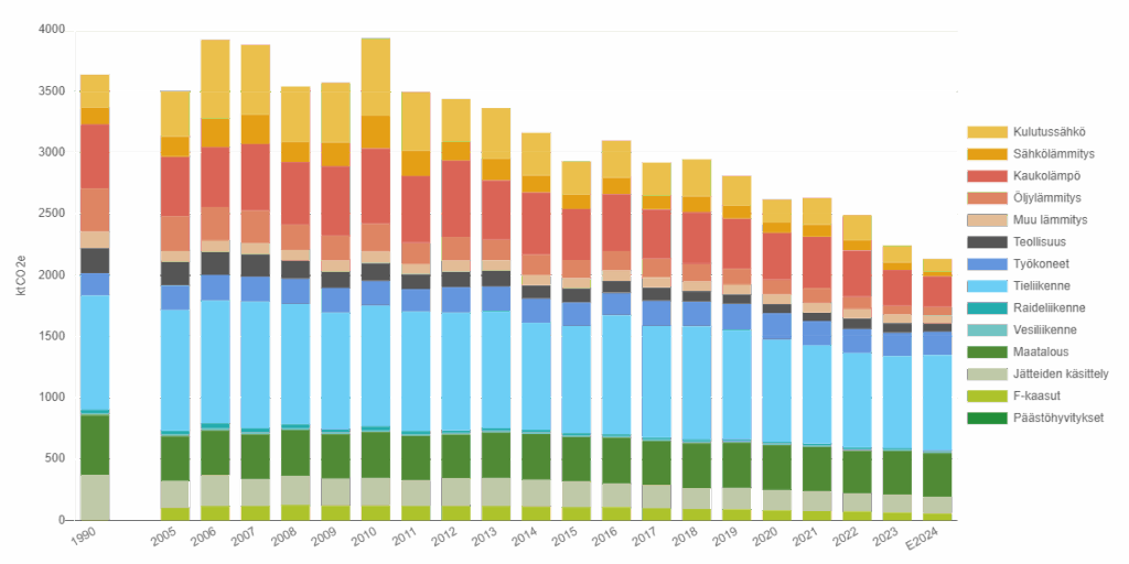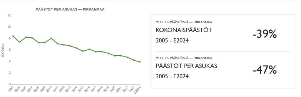 SYKE:n laskemien ennakkotietojen mukaan Pirkanmaan kokonaispäästöt ovat vähentyneet vuoden 2023–2024 välillä noin 5 %.